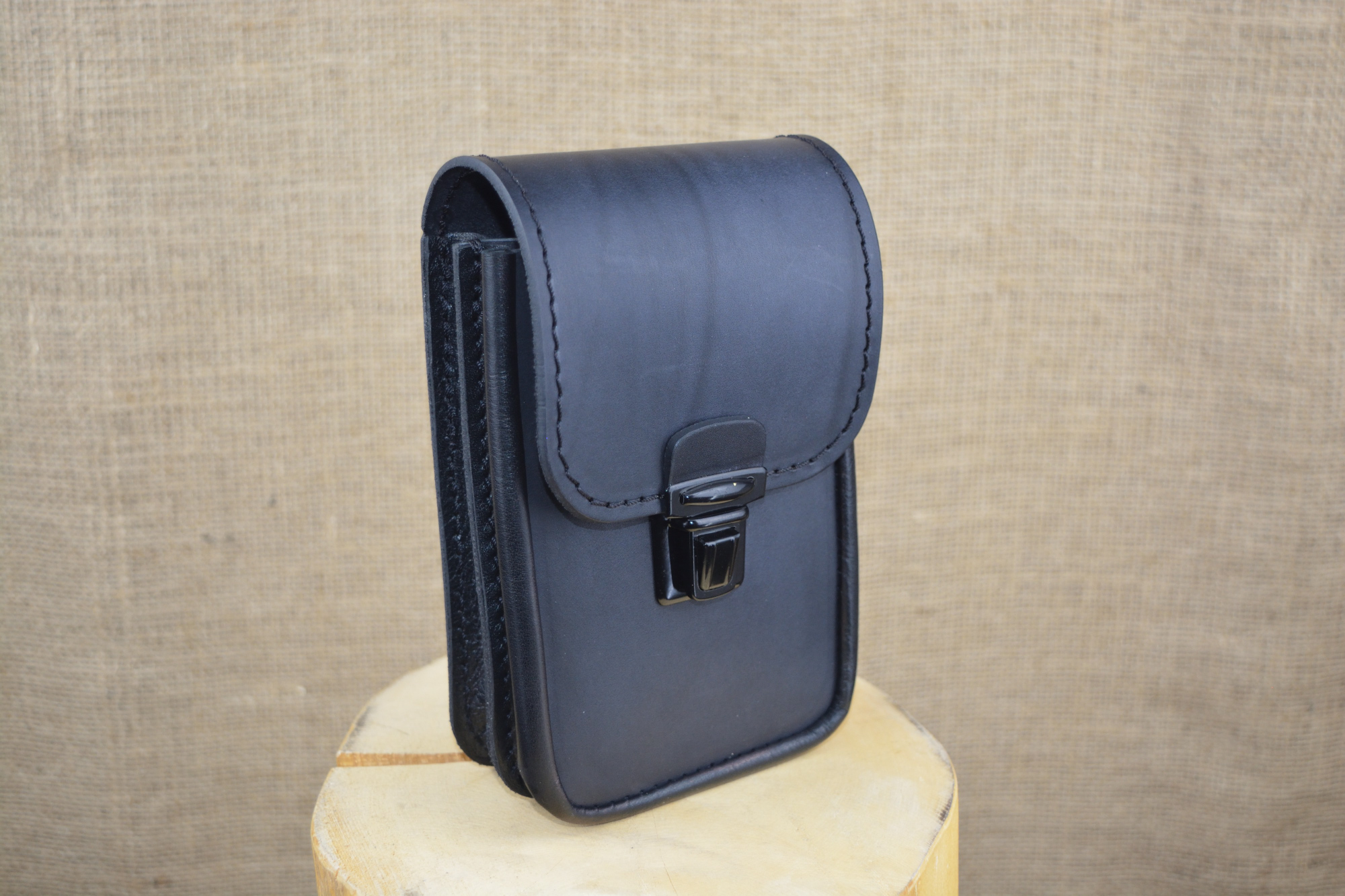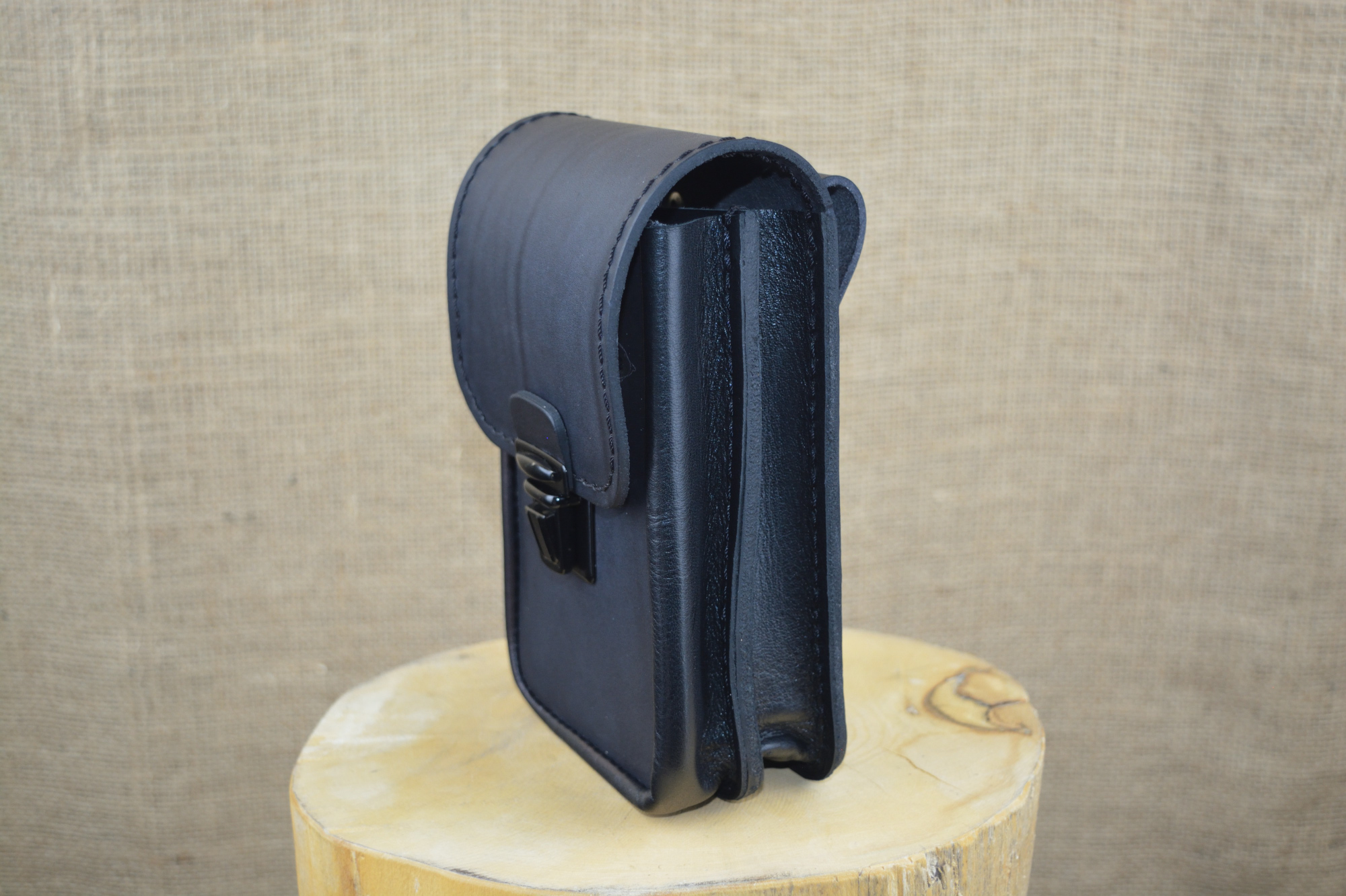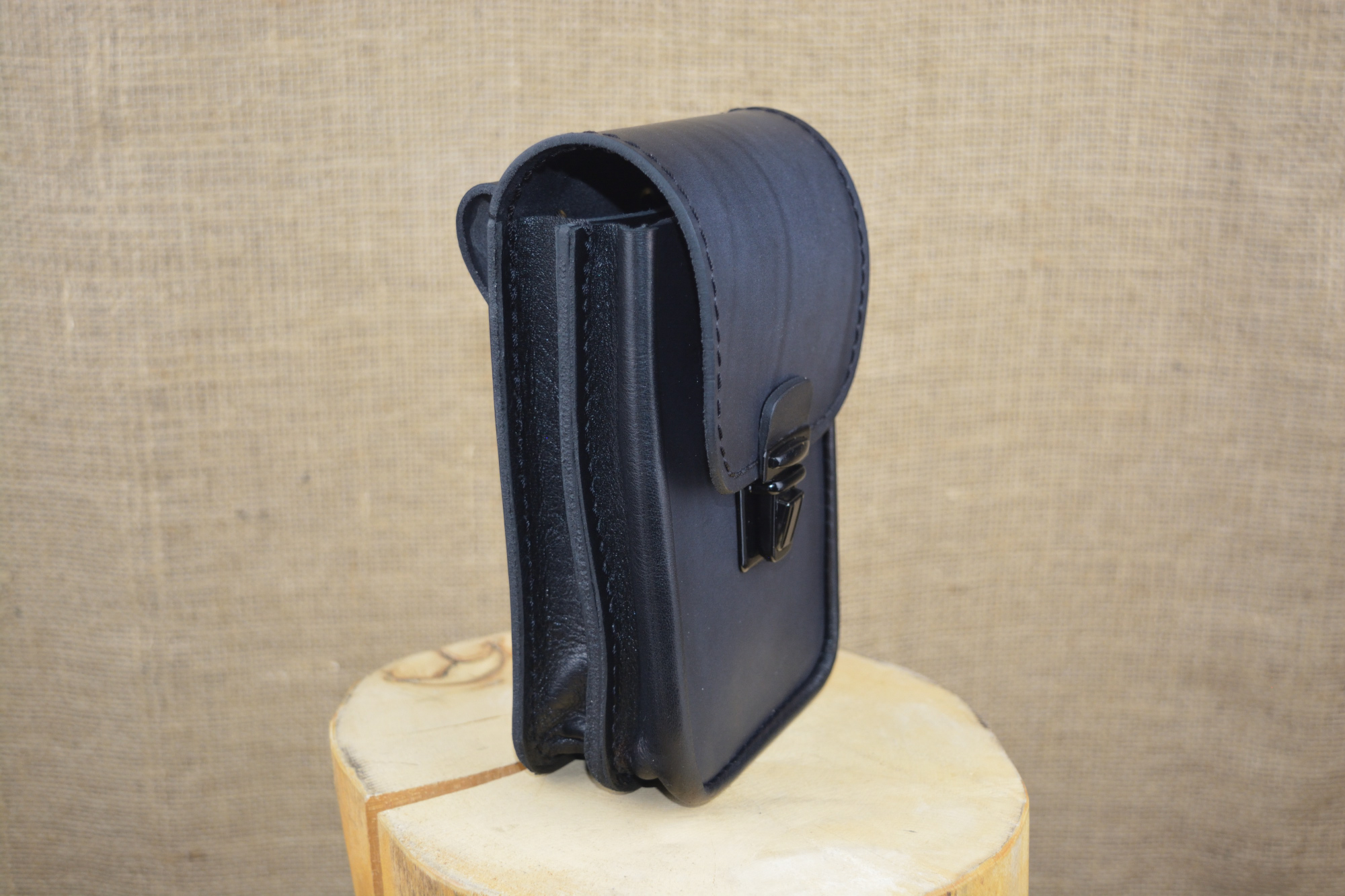 Kožená kapsa vysoká na zámeček L, pravá hovězí kůže, černá, dvě přihrádky, na opasek, zapínání na zámeček
