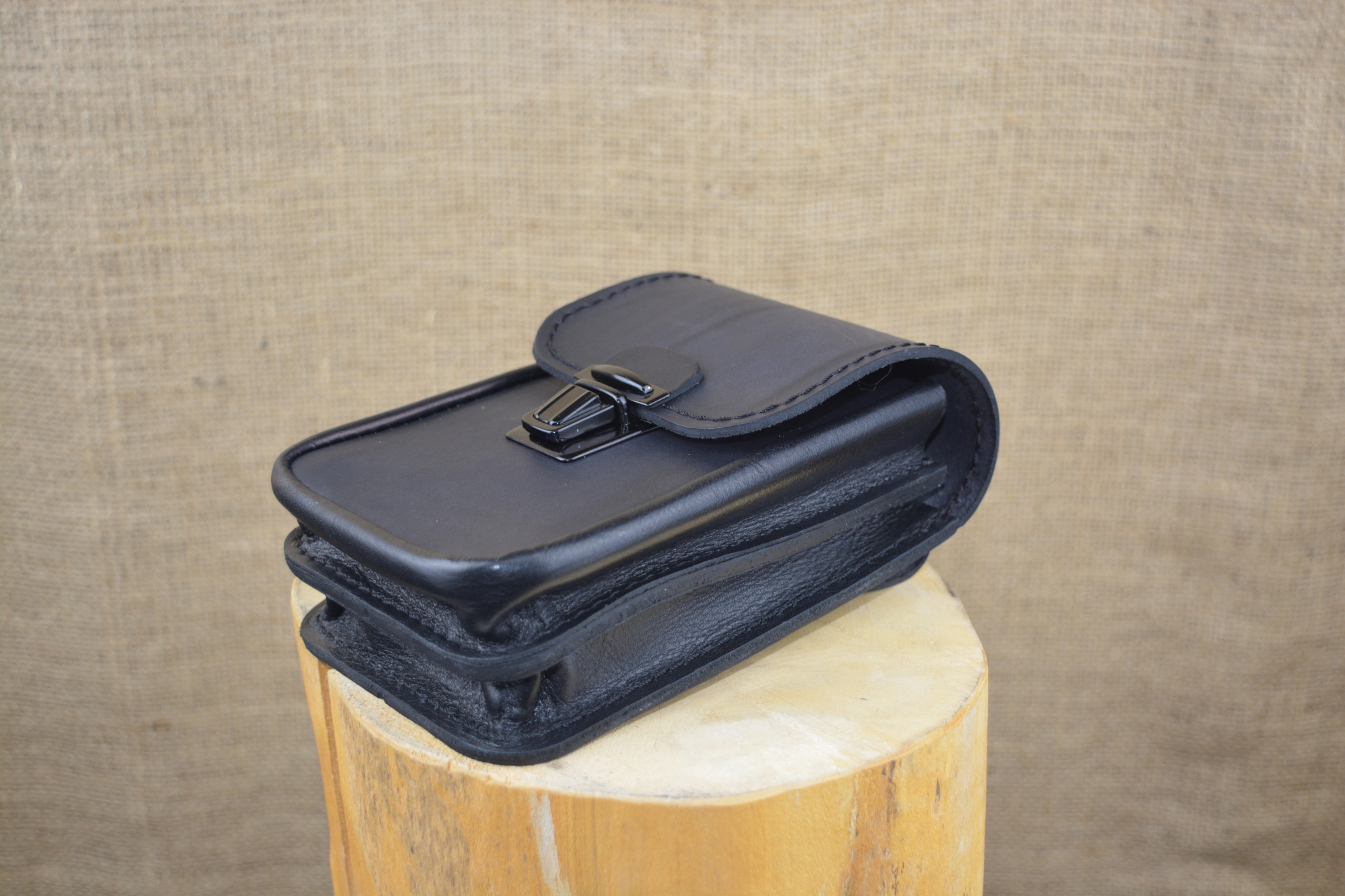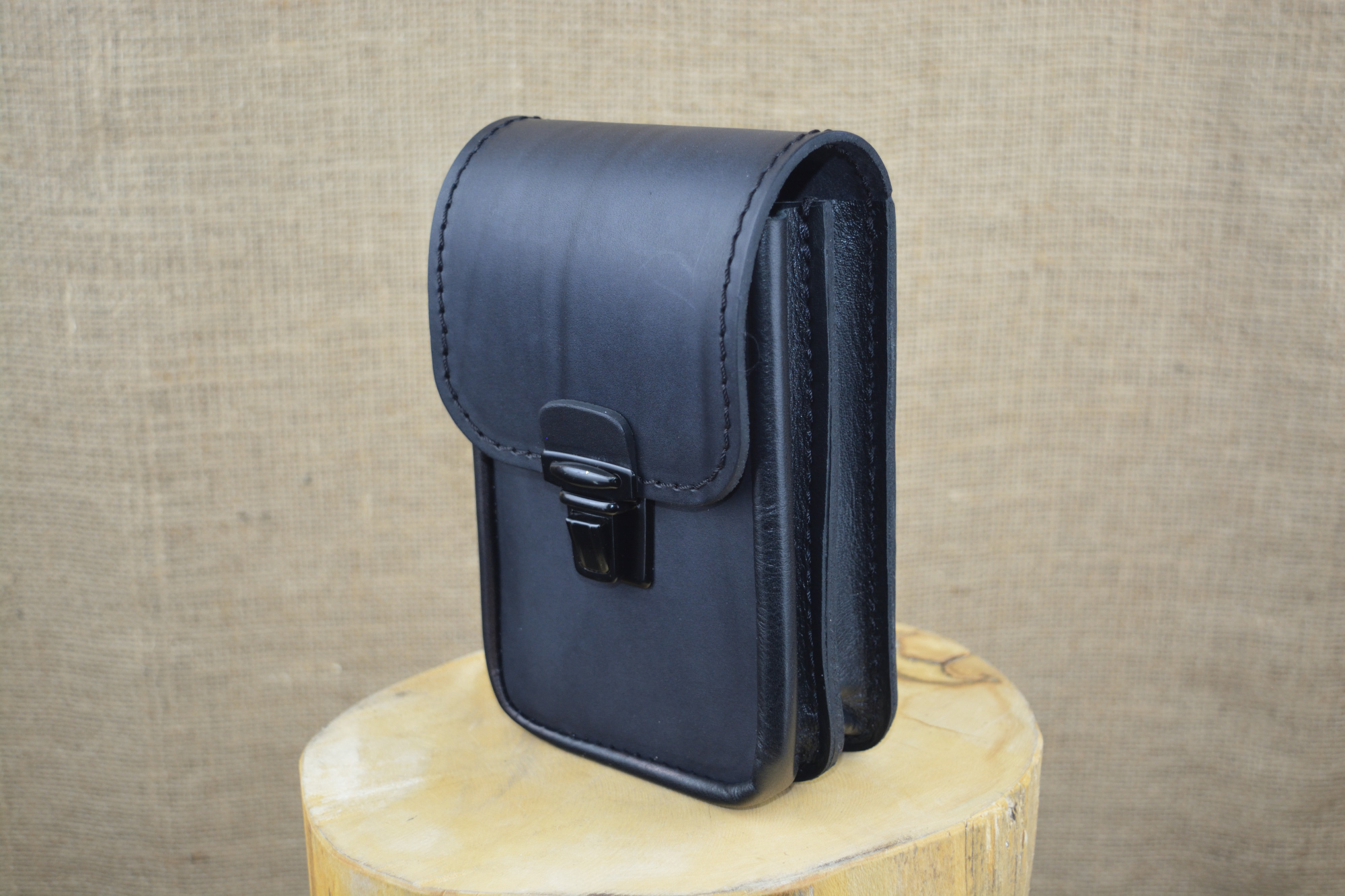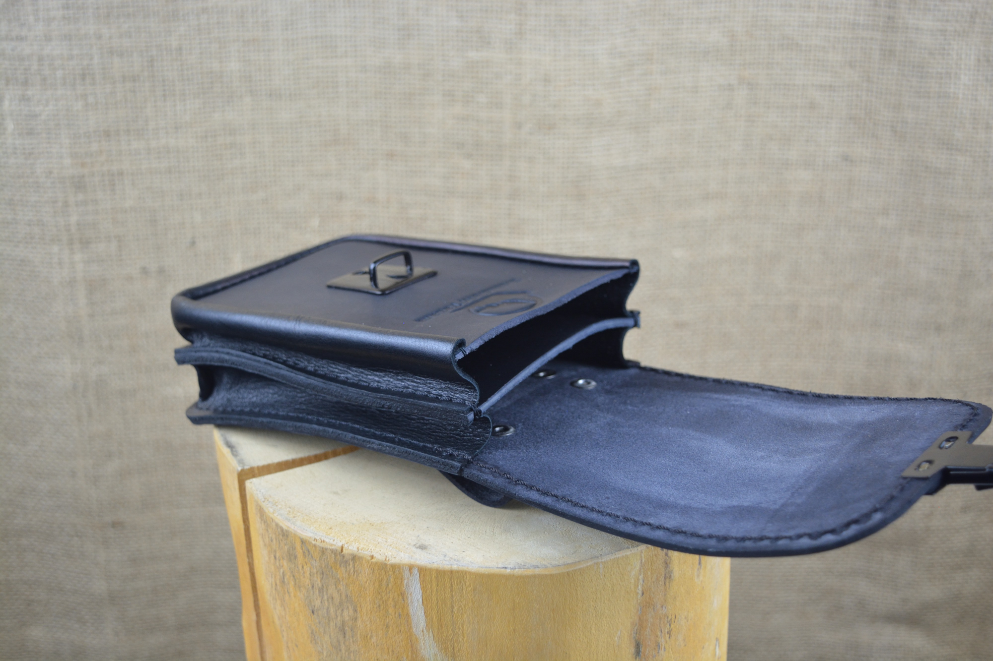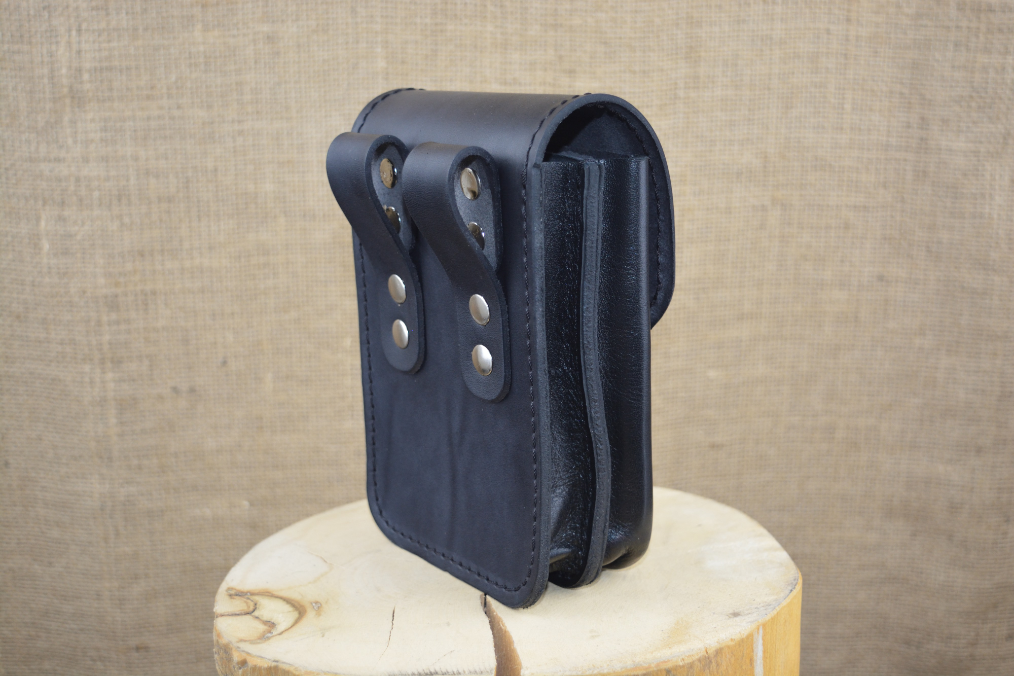 Kožená kapsa vysoká na zámeček L, pravá hovězí kůže, černá, dvě přihrádky, na opasek, zapínání na zámeček