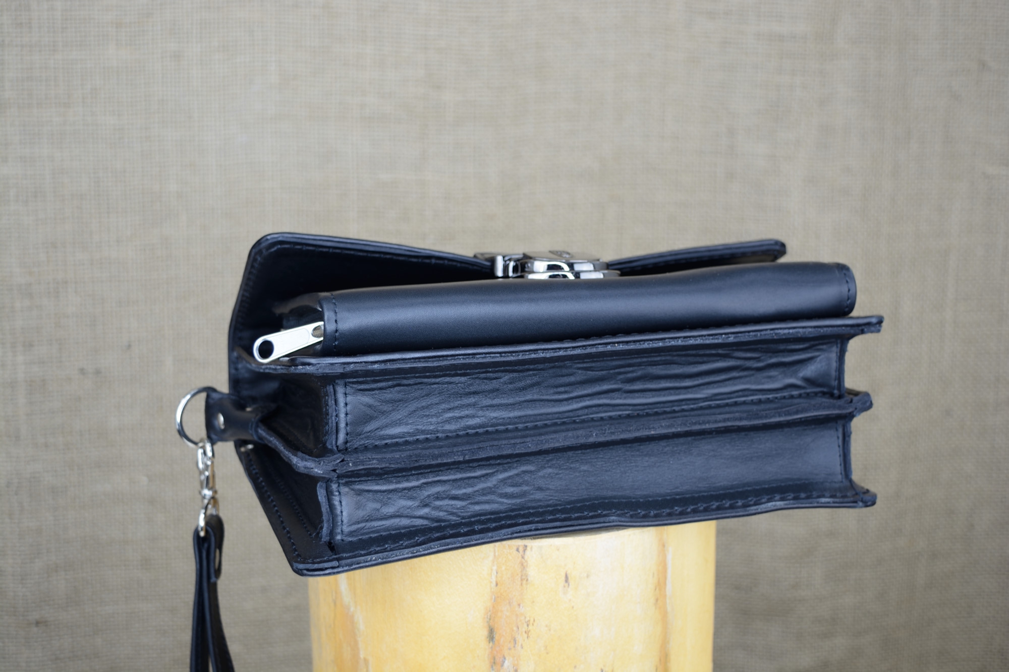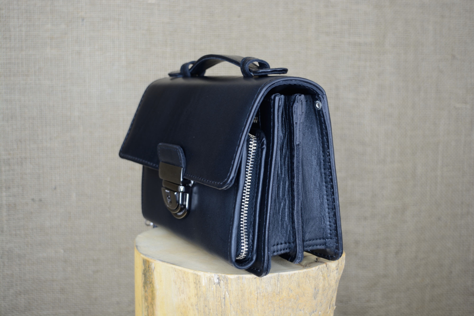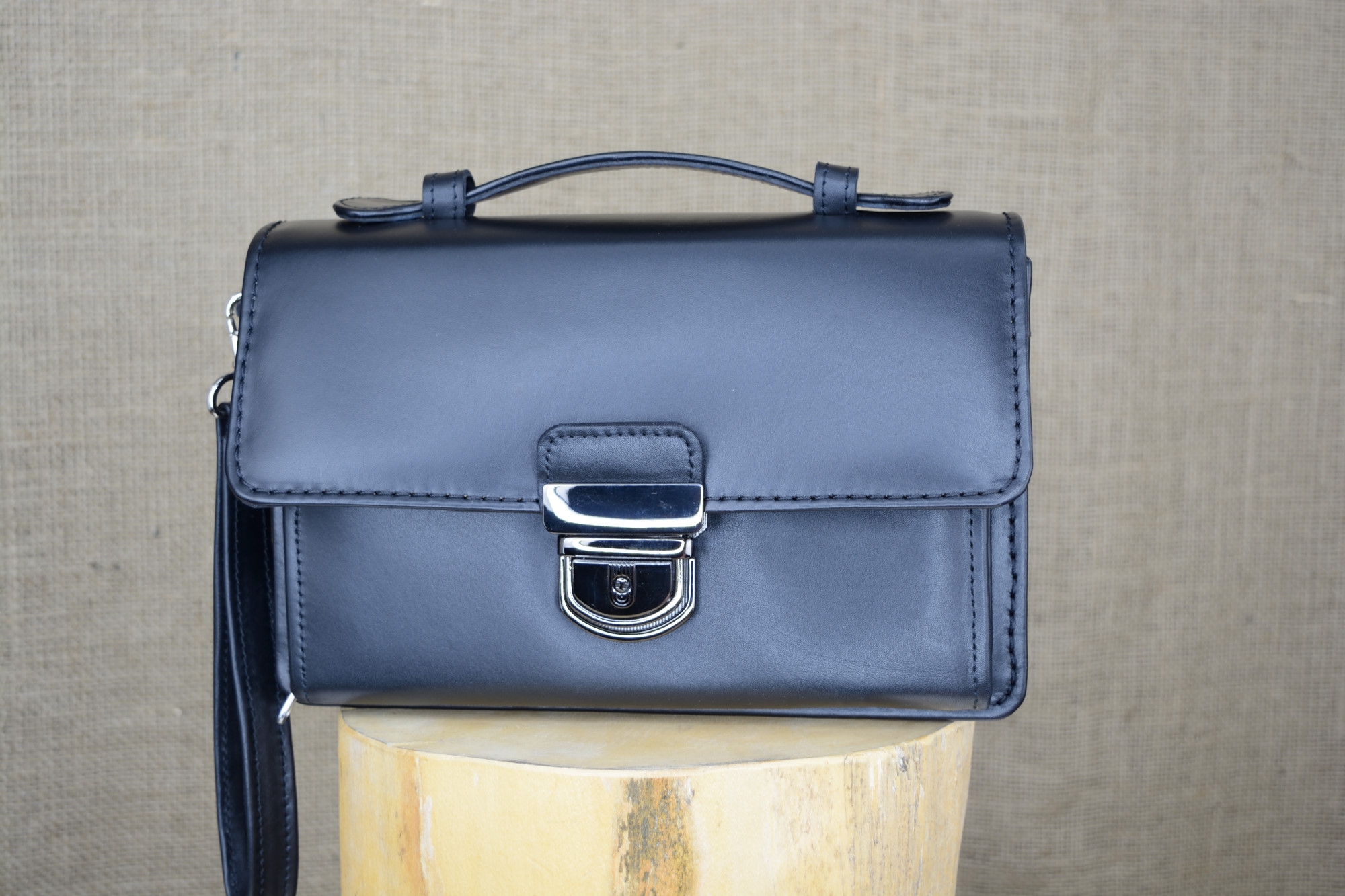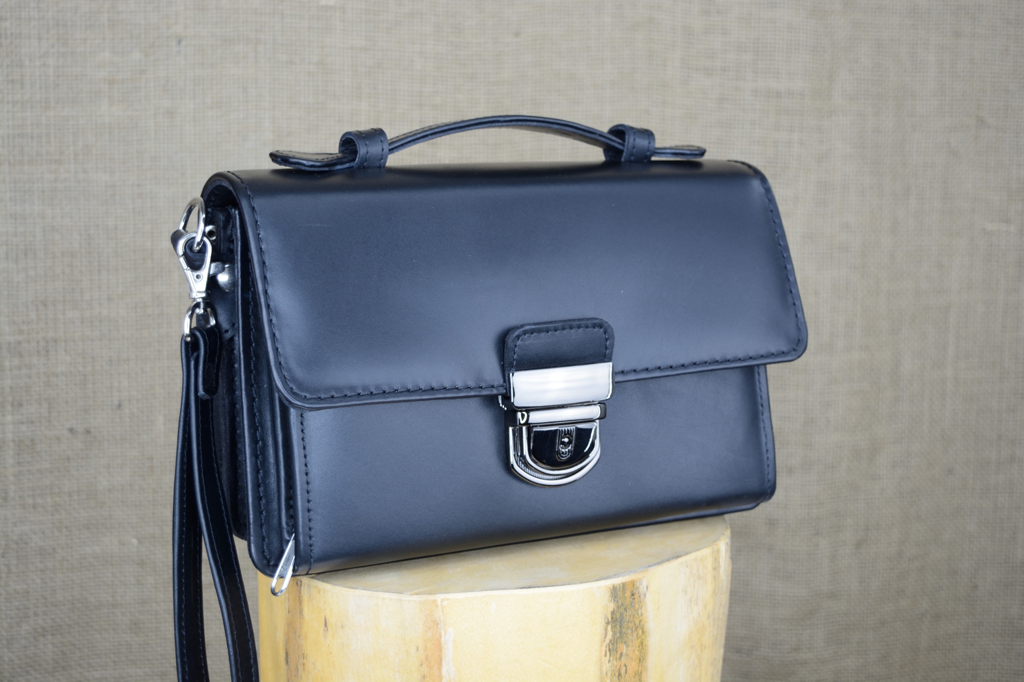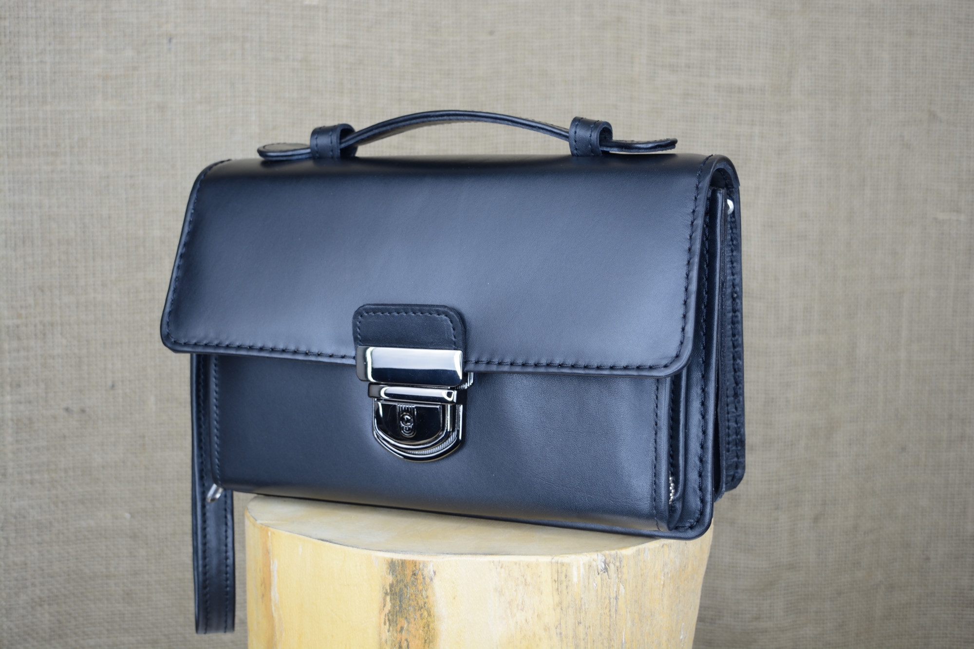 Pánská kožená příruční taška s přední zipovou kapsou na doklady - kvalitní pánská příruční taška vyrobená z pravé hovězí kůže - usně. Pánská kožená příruční taška s přední zipovou kapsou na doklady má dvě přihrádky, které odděluje ještě jedna kapsička na zip. Na předním díle se nachází pod uzavírací klapnou ještě jedna zipová kapsička a ještě jedna zipová kapsa na doklady. Ta obsahuje přihrádky na karty, kapsičky na drobnosti a uzavíratelnou kapsičku na druk. Příruční taška se uzavírá na klapnu pomocí kovového zámečku. Na boční straně má příruční taška malé kožené držátko do ruky (poutko na ruku) připevněné k tašce pomocí karabinky.