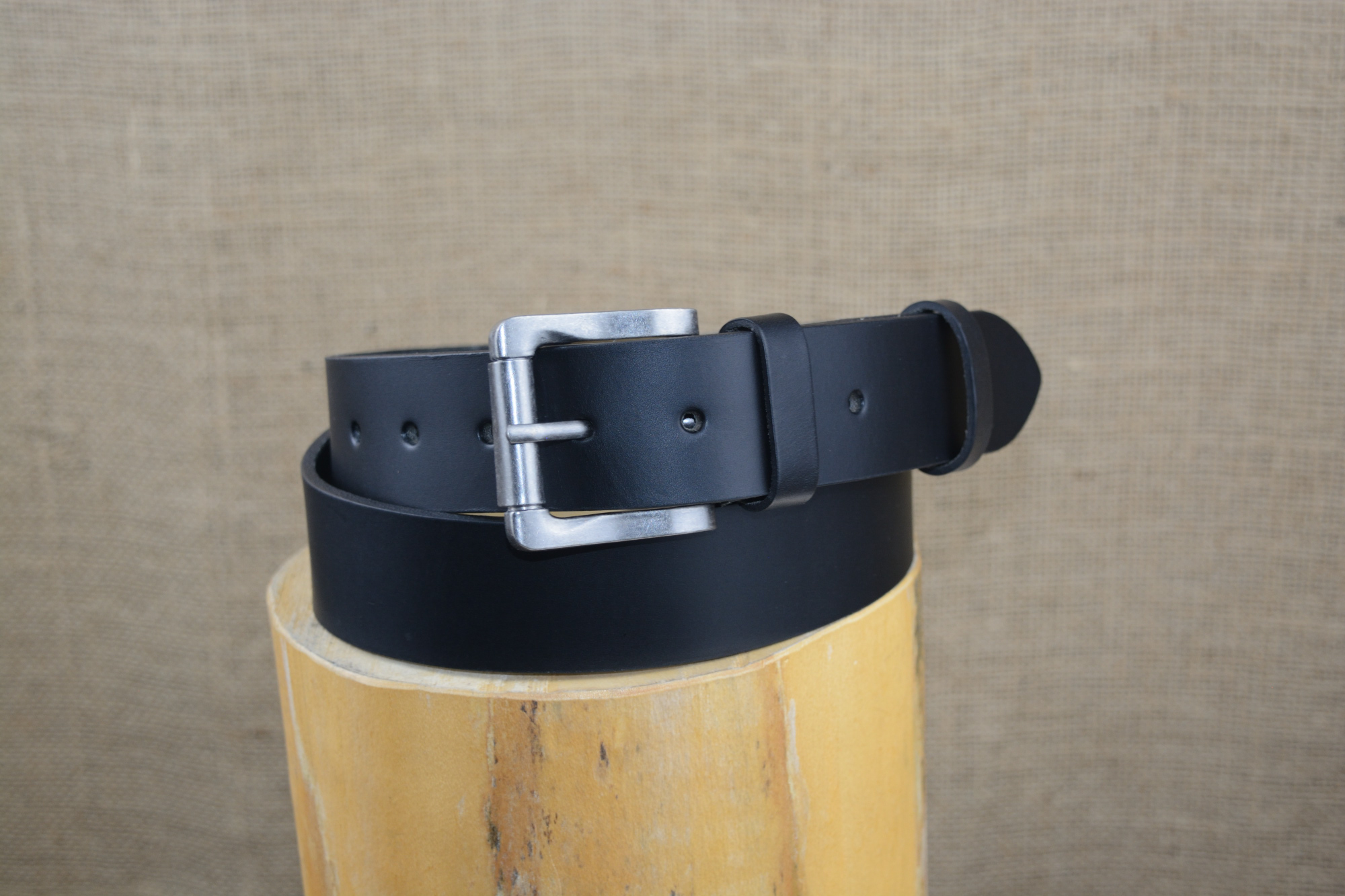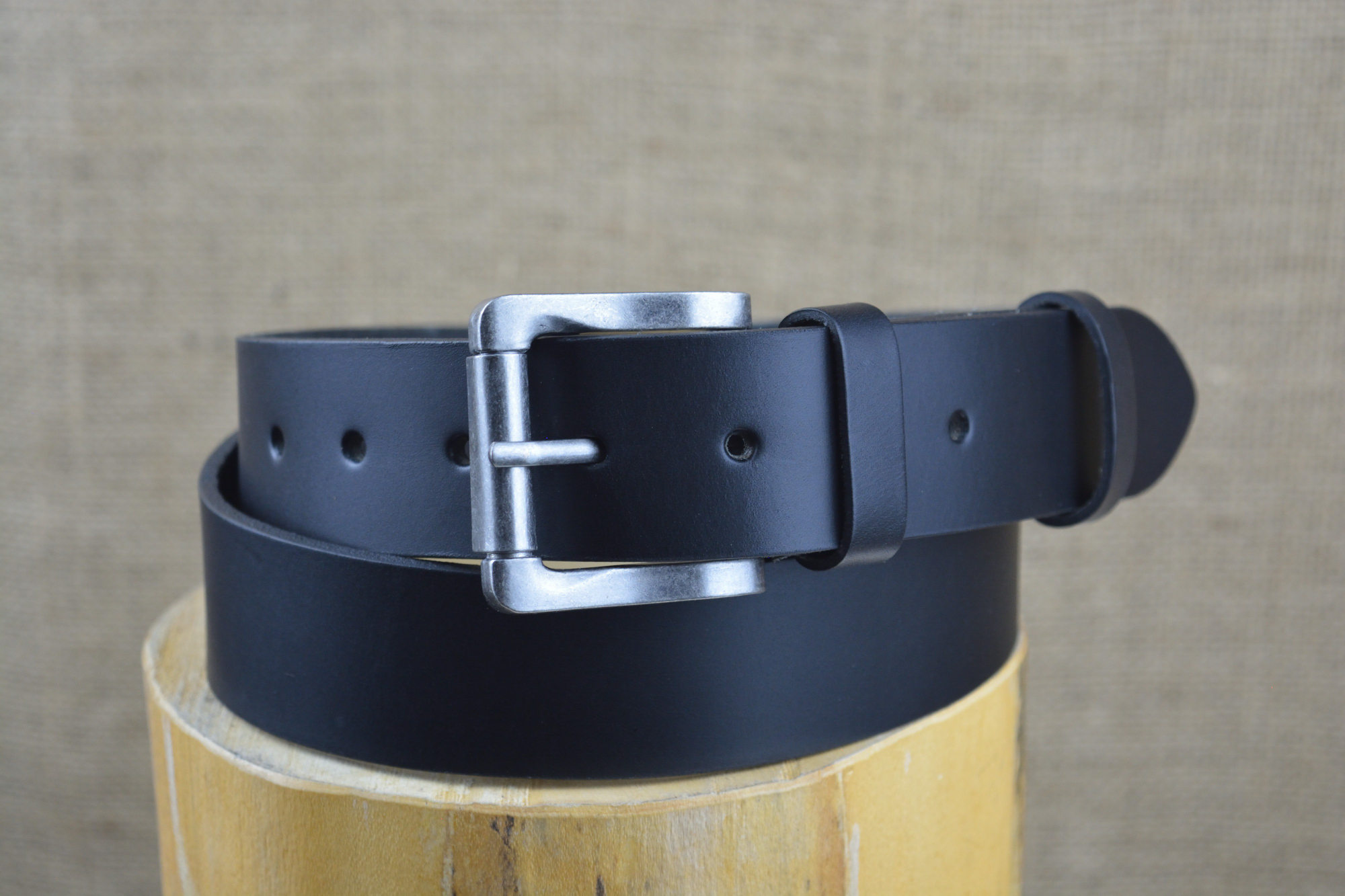 Kožený opasek pro běžné nošení, pravá hovězí kůže, černý, šířka 4 cm, obvod pasu na míru, dvě poutka, kovová přezka