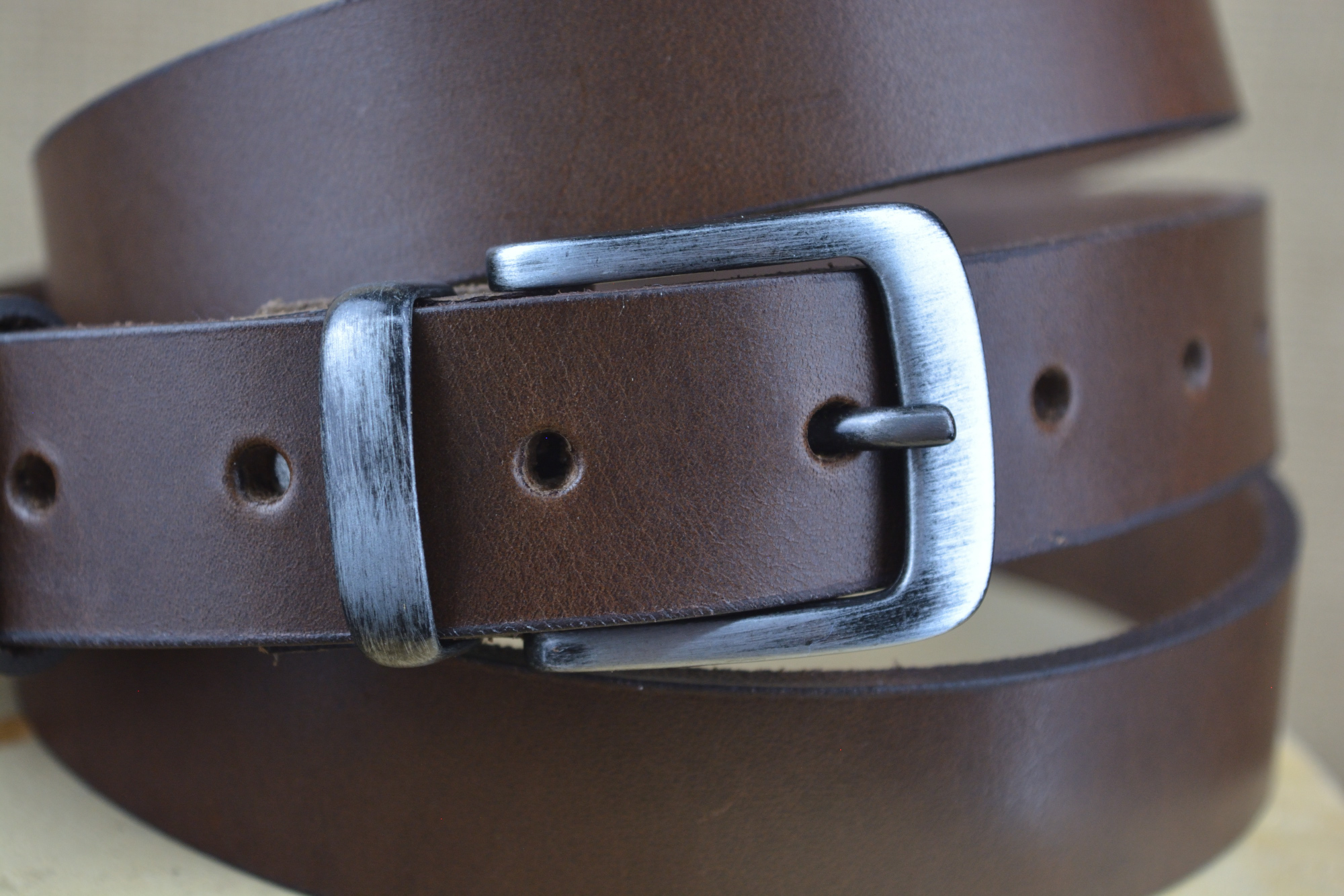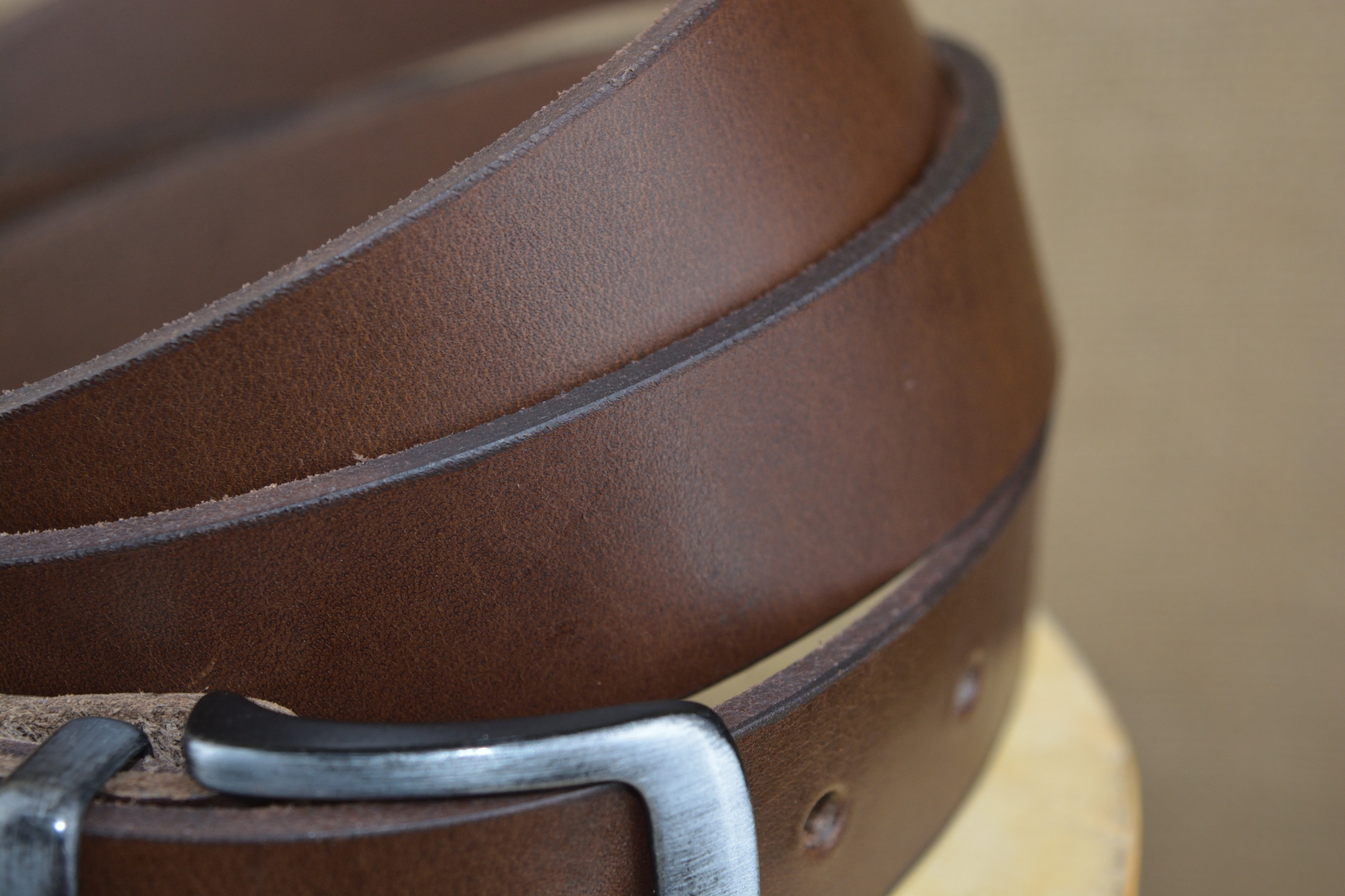 Kovová přezka je k opasku připevněna pomocí koženého úchytu a šroubku. Všechny naše opasky jsou řezané a po hranách, které nejsou nijak hlazené, je vidět řez pravou kůži. Do všech opasků vysekáváme 7 dírek. Délku opasků, vždy upravujeme na míru.